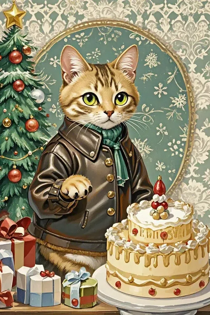 在这幅画中,我意在营造一种温馨欢乐的圣诞氛围,因此选择了一只猫作为主角。猫身穿时尚的皮夹克,围着绿色的围巾,不仅彰显了它的个性,也呼应了圣诞节的绿色主题。画中的圣诞树上装饰着五颜六色的球和一颗星星,树下堆满了礼物。这些元素传达着节日的喜悦。背景中的雪花图案进一步增强了圣诞气氛。在绘画过程中,我注重色彩搭配和光影处理,力求使画面更加生动,富有质感。我希望这幅画能给观者带来温暖和快乐,就像圣诞节一样。