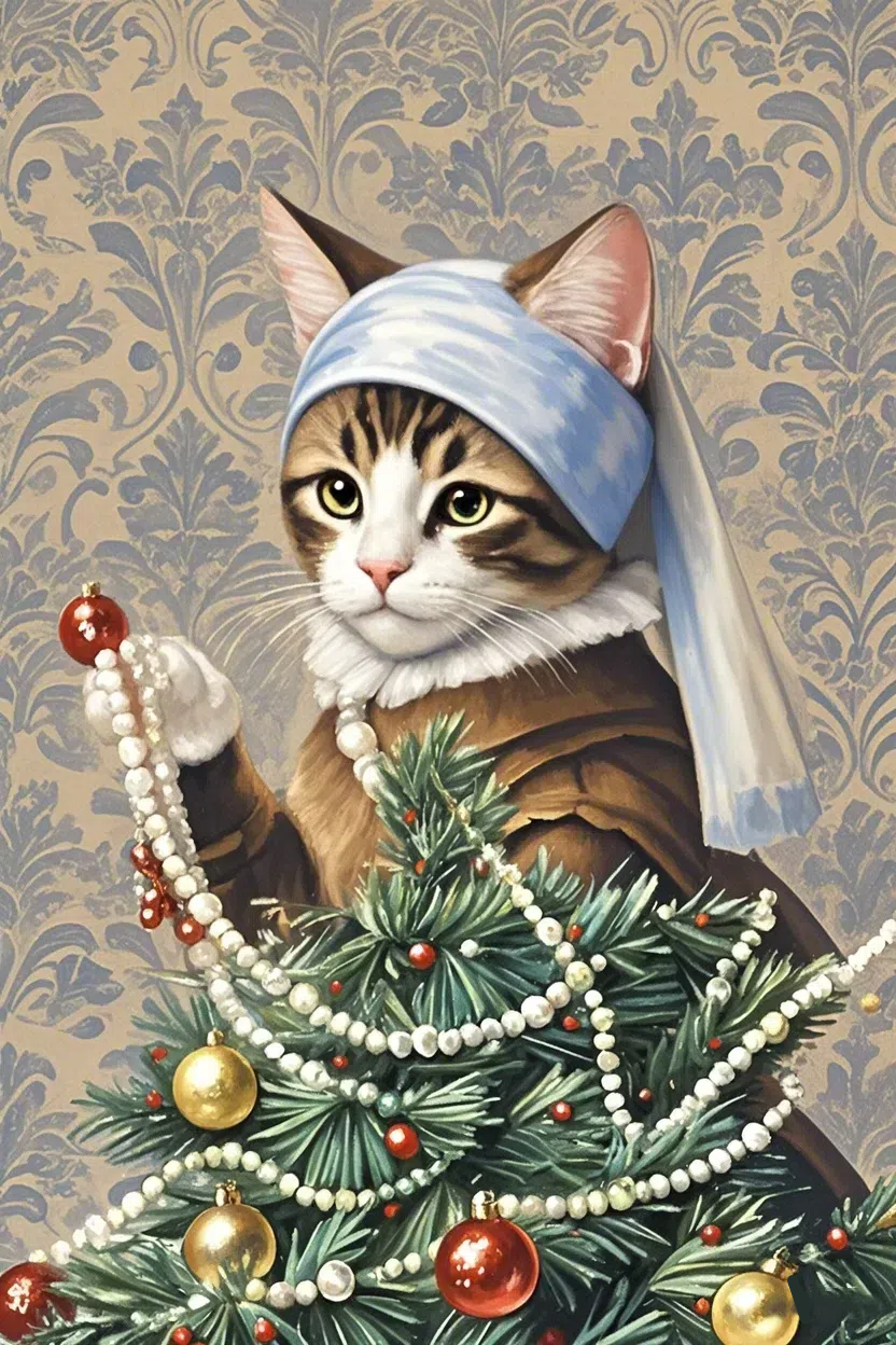 这幅画是我对圣诞气氛的抽象演绎。猫咪佩戴的蓝色头巾犹如一片宁静的深海,神秘而深邃,象征着内心的平静。圣诞树上的装饰物、彩球、珍珠链像是从现实中提取出来的情感符号,它们交织纠缠,代表着节日欢乐、团聚的复杂情绪。背景的图案像是脑海中的思维线条,杂乱无章却又和谐共存,营造出一种超现实的氛围。作为画面的核心,猫咪的存在不仅是一个具象的形象,更像是一个情感的凝结点,将所有抽象的元素融为一体,展现出独特的圣诞意境。